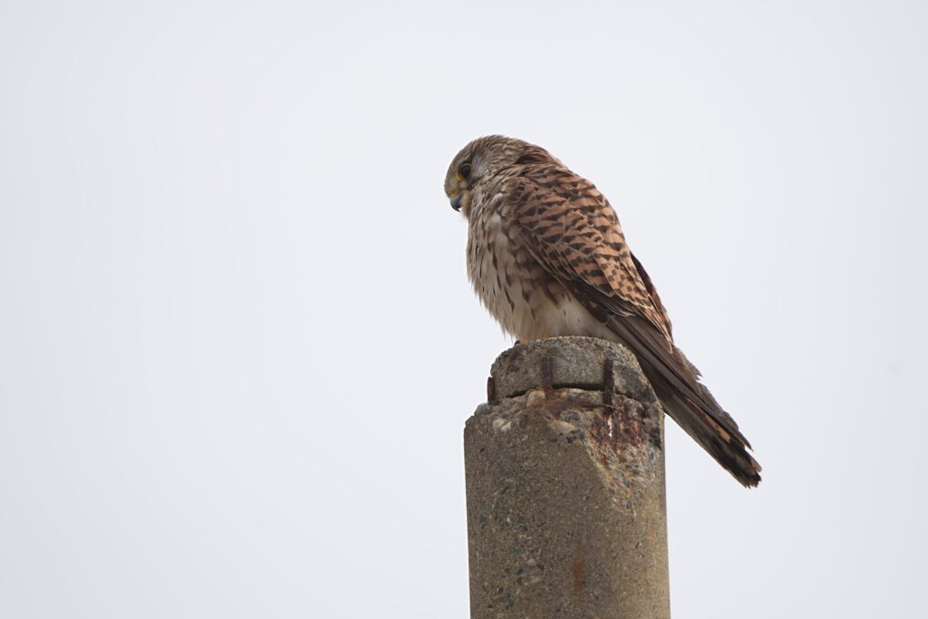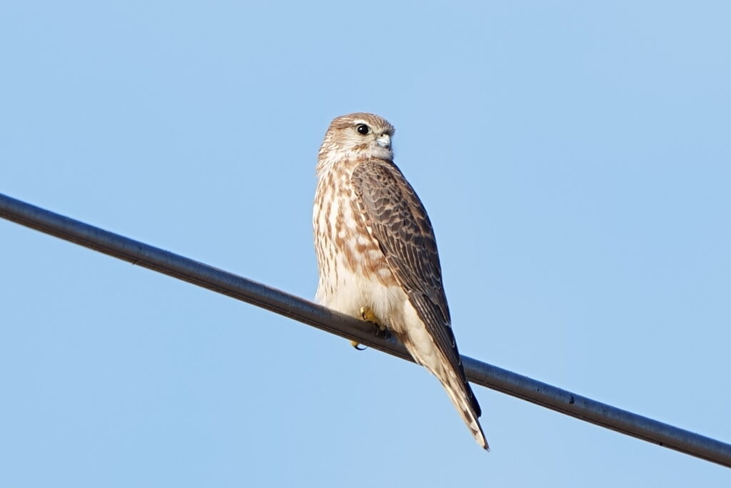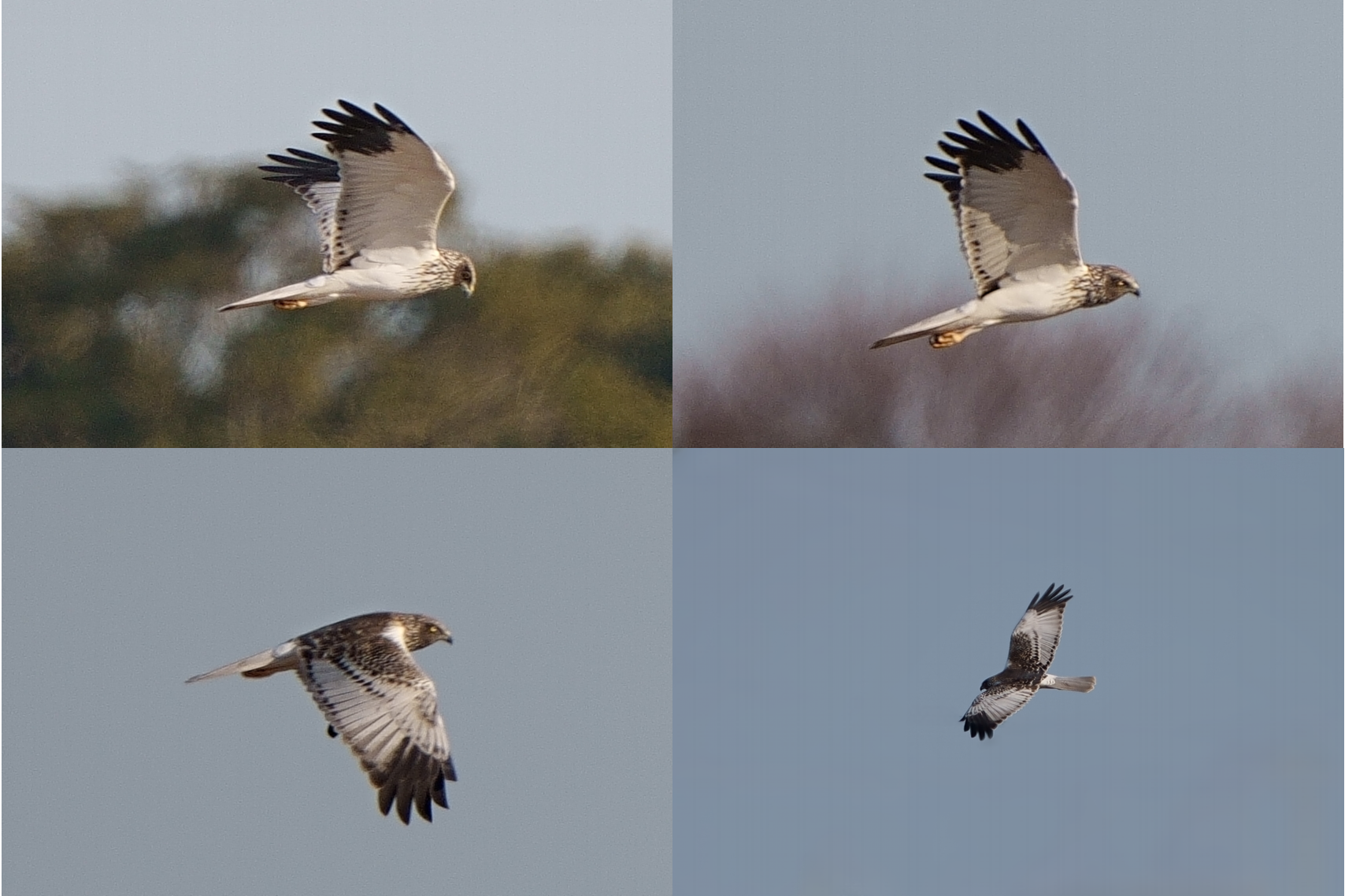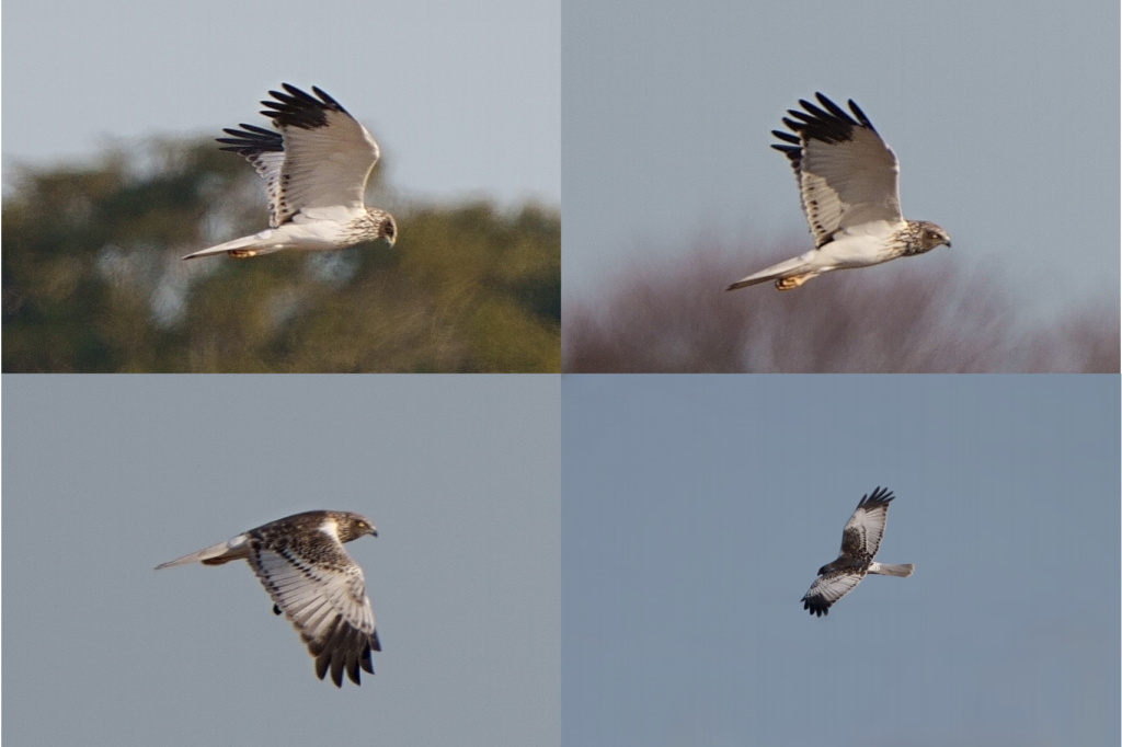 最初に視界に入ったときは、初列風切羽が黒いのが目に入り、「ハイイロチュウヒの♂か⁉」と思いましたが、写真で確認すると頭がグレーでないことが判明。画像をAIでチェックしたところ、「チュウヒ若・淡色型」との見解でした。よく「ズグロチュウヒ」と呼ばれている本個体は、分類学的には「チュウヒ」に属しているそうで、よく見る成鳥♂(灰色)・成鳥♀(褐色)のチュウヒとは見た目が異なるので俗称としてつけられたとのことでした。つまり、ゴイサギの幼鳥がホシゴイと呼ばれているようなものですね。遠かったのでピンボケ連発でしたが、初めて出会えて夢中でシャッターを切りました。