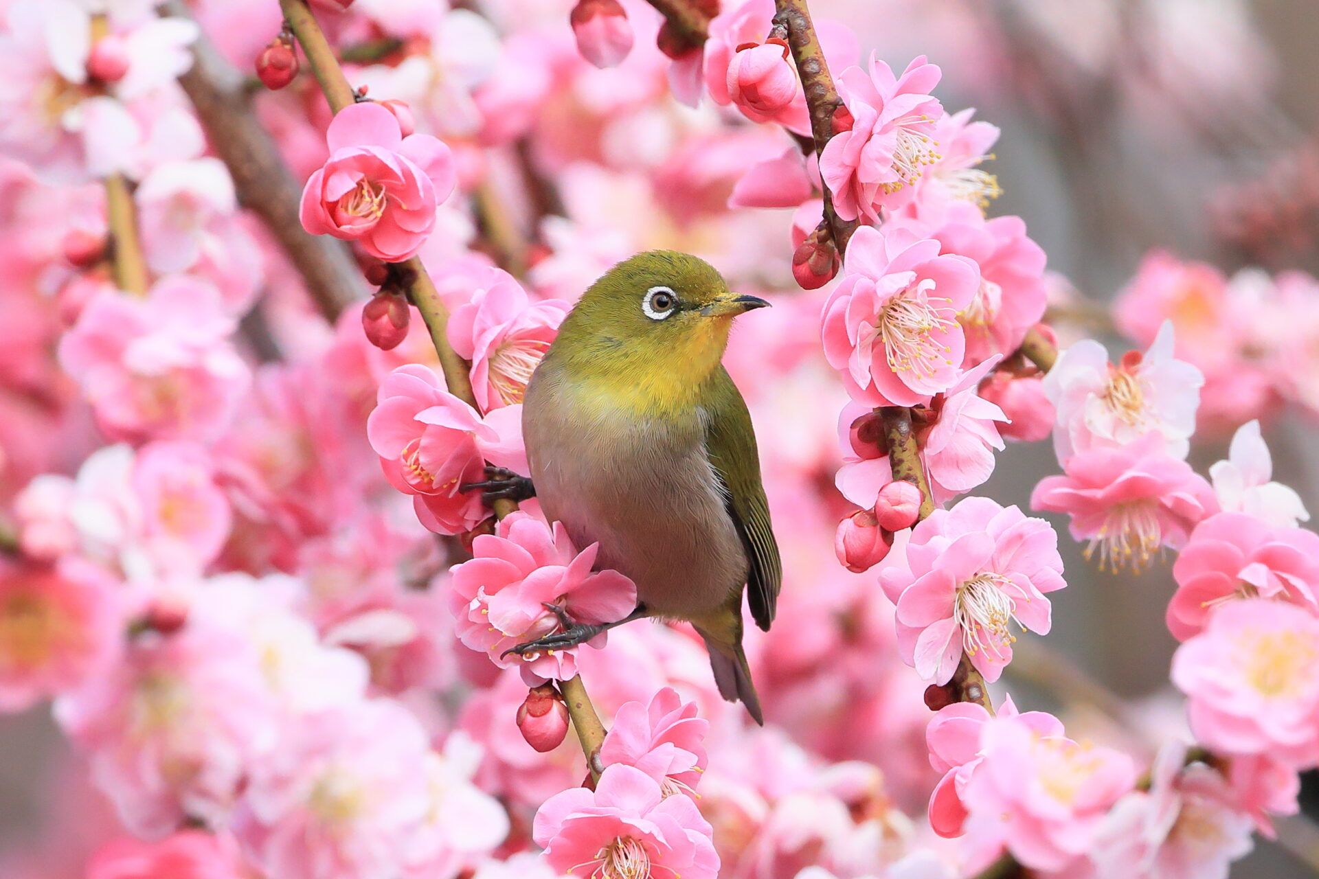 一方、既に満開の枝垂れ梅の方には蜜を求めてメジロやスズメが飛び回っていましたので、咲き始めた河津桜と併せて載せておきます。