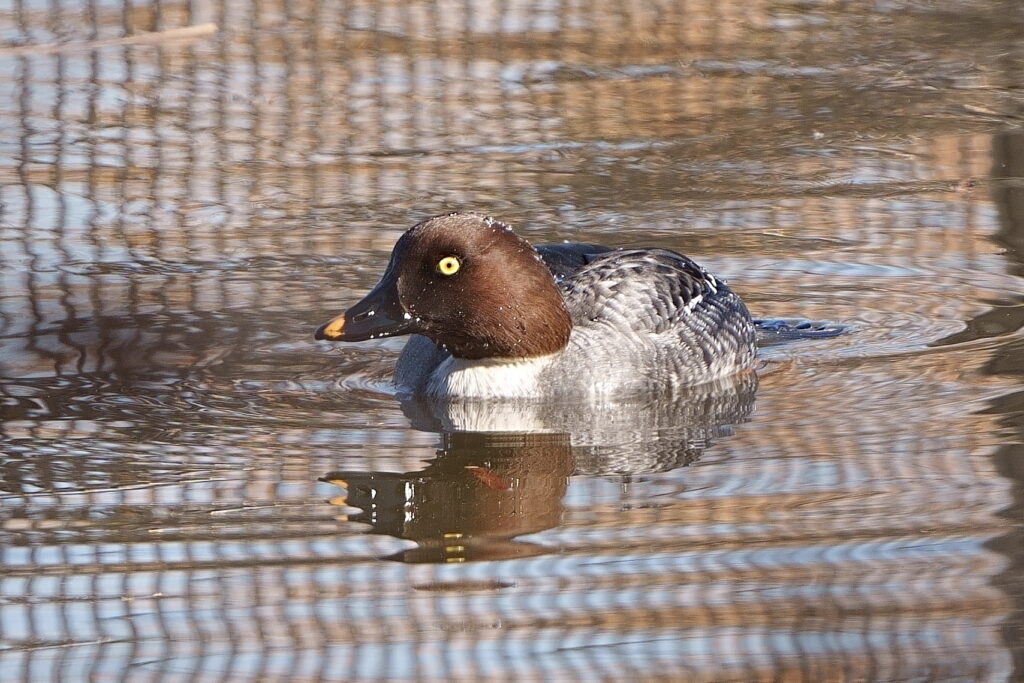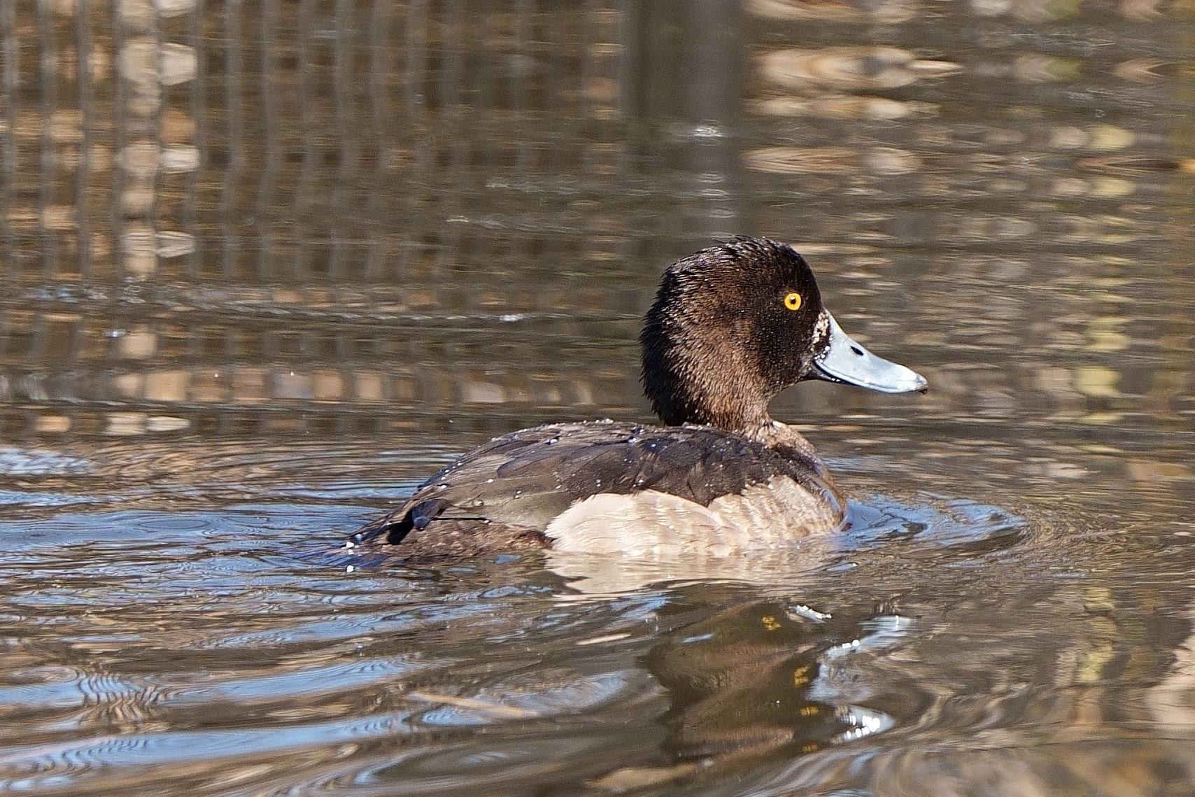常連客のカルガモ、マガモ、コガモに混ざり、何やら茶色っぽいカモを発見。「キンクロの♀?」と思いながら双眼鏡を覗くと、首の下に白い輪があるのを確認。なんと、ホオジロガモのメスでした。たしか市内では、10年前の観察会(新川耕地→江戸川)で観察したのが最後だったと思います。いなくなる前にと、早速撮影に行ってきました。