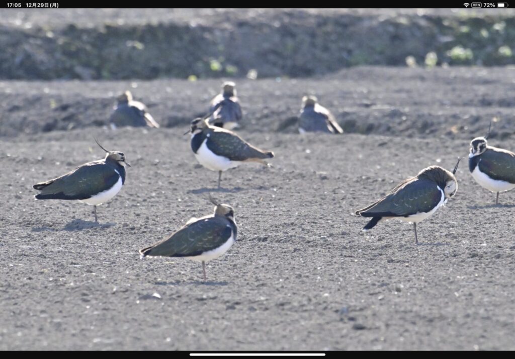 先ず初めに、住宅街を抜けた江戸川近くの田畑で、多くのタゲリを観察します。その数93羽!(12/29確認)もはや野鳥ではなく飼育されているみたいな光景であり、順光側からの観察では、カワセミとはまた違ったタゲリの構造色をバッチリ確認できます。