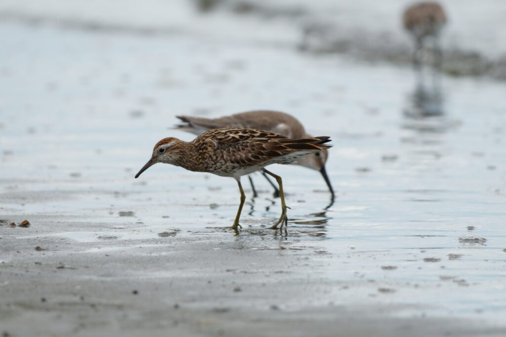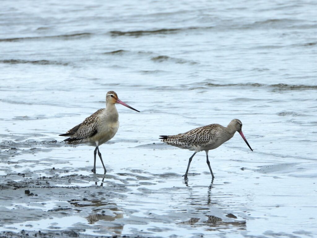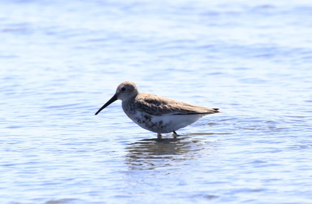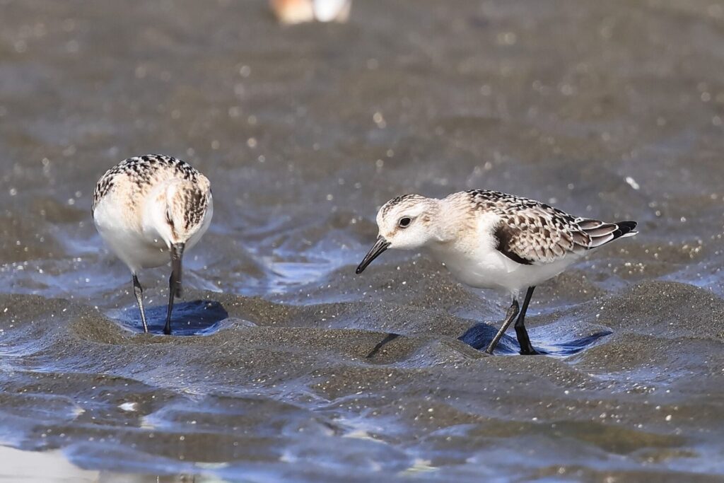 本日は大潮で干潮が10時59分、目の前にはすでに潮の引いた干潟が広がっていました。ウミネコが飛び交う潮溜まりを進んでいくと、最初に出迎えてくれたのはトウネン、ミユビシギたちです。大きさの違いが良く分かりました。