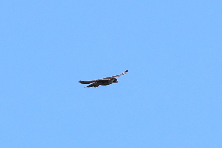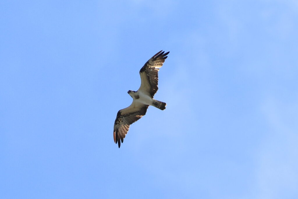 そろそろ展望デッキに引き上げようとすると、今度はミサゴが帆翔していました。ミサゴは水中にダイブして魚を獲ります。まさかシギ・チドリたちを襲うことはないと思うのですが・・