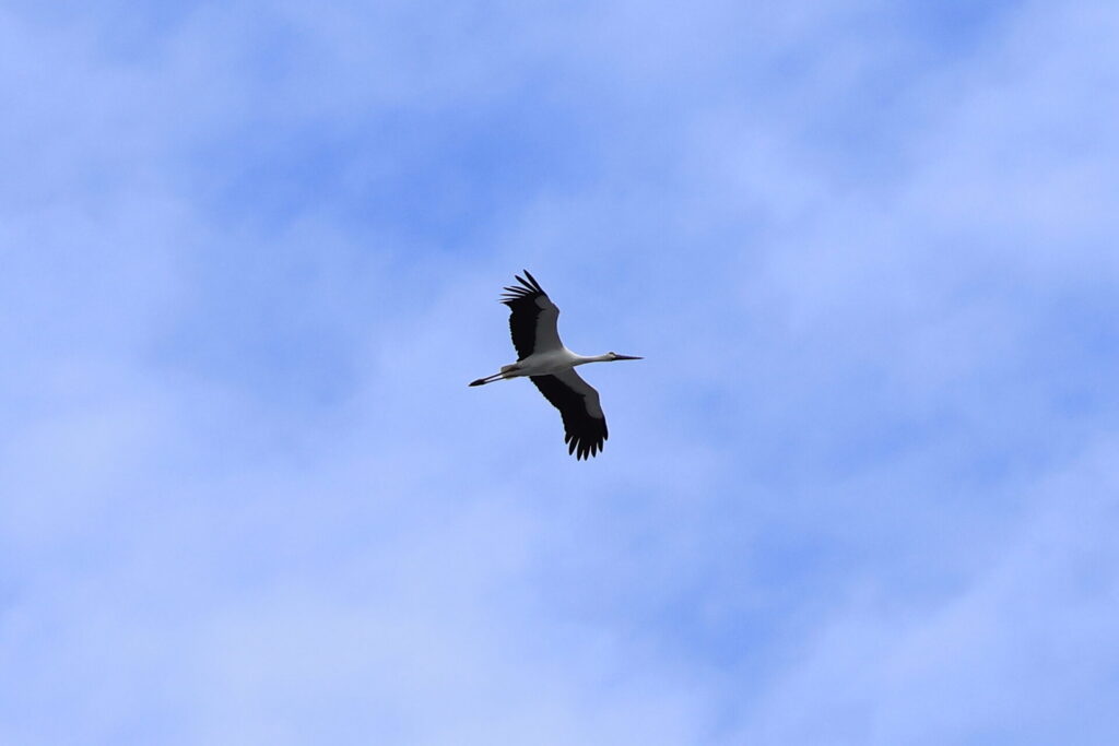 水辺公園から対岸へ渡ると、上空を見慣れない物体が羽ばたきもせずに野田方面へ滑空飛行、それも2羽。アオサギにしては妙に大きなサギ姿です・・。「コウノトリだ!」。 6月観察会に見た「ヤマト」、「ひなた」に間違いありません。思わぬ出会いに一同大感激。