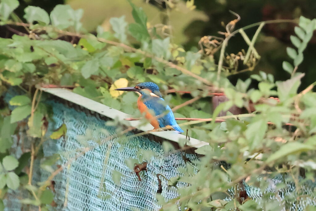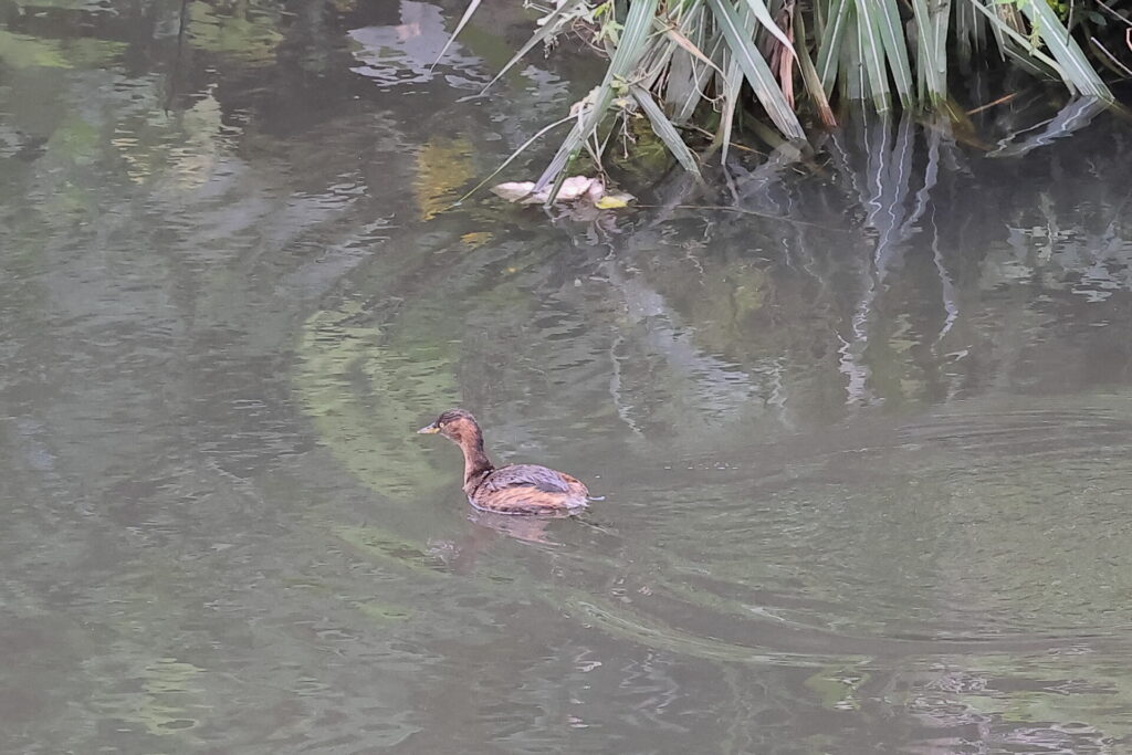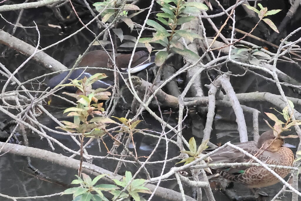理窓公園を目指して運河を進むと、数羽のカルガモの中にマガモが1羽。肩身が狭そうでした。2羽の小さなカイツブリはすぐに潜るので、スコープには中なか入りません。バンとコガモは水際の枝藪に見え隠れ。モズの高鳴きは秋本番と響きます。久しぶりの観察会は、一喜一憂しながらほのぼのと進みました。
