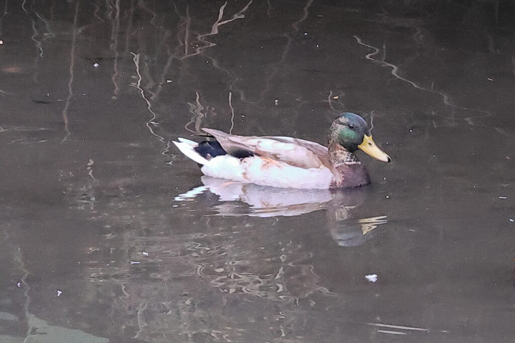 やっと「白鳥の池」にたどり着くと、入り口の柵の上でカワセミ君がお出迎え。一度飛んだこのカワセミ君は、池の淵に止まり最後まで楽しませてくれました。池中央にはカルガモと20羽ほどのマガモたちがいます。まだ換羽途中のオスなど容姿は様々、ここでひと冬を過ごします。