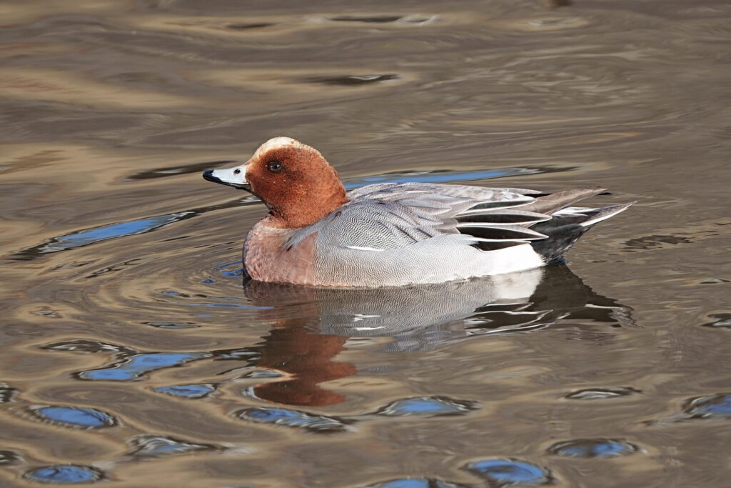 昨年は西口を出て親水広場のヒドリガモを見てから運河を渡り、理窓公園へ向かったのですが、今年のヒドリガモは「ふれあい橋」の東側に定着しています。親水広場には行かず直接「ふれあい橋」へ向かいました。橋を渡ると、「いるわ、いるわ」100羽以上のヒドリガモが静かな水面や陸に上がり採餌をしていました。晴れて風のない絶好の観察会びよりです。