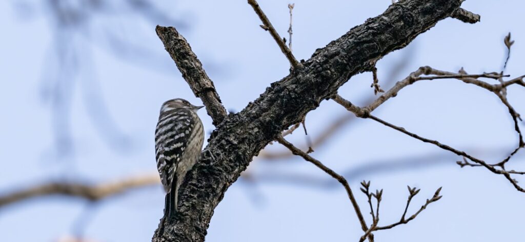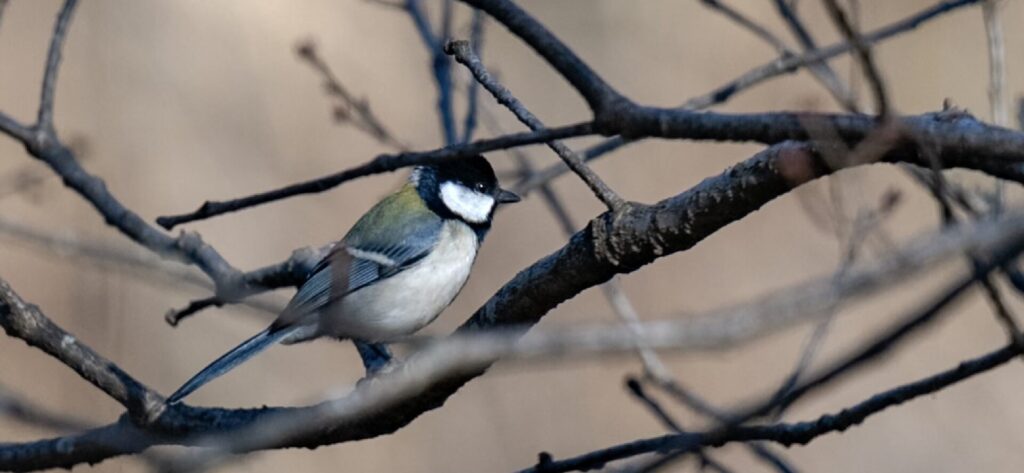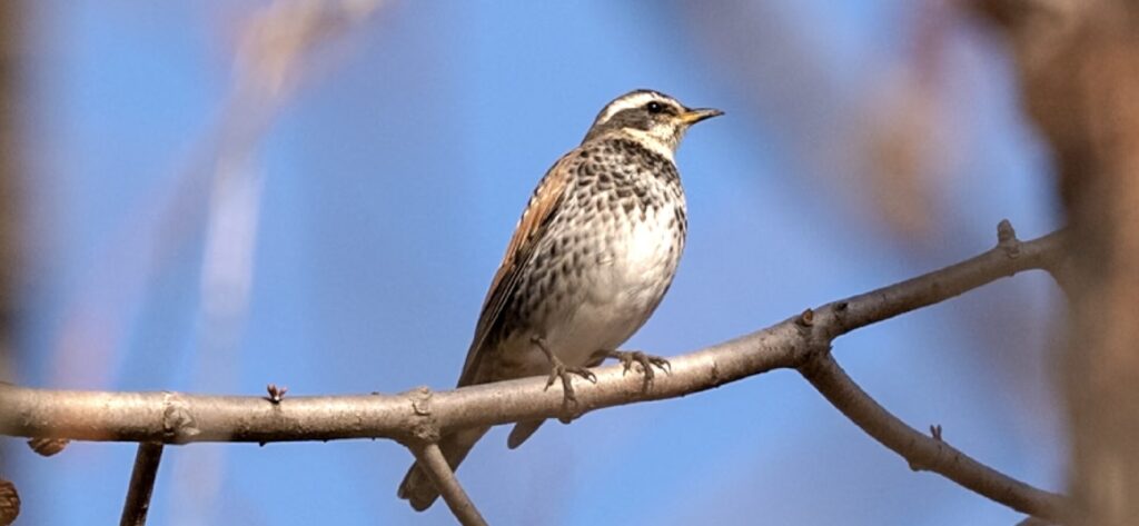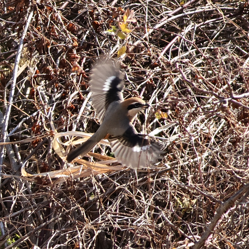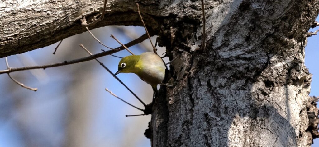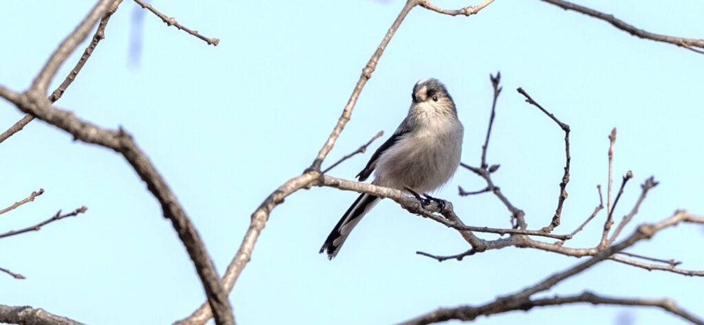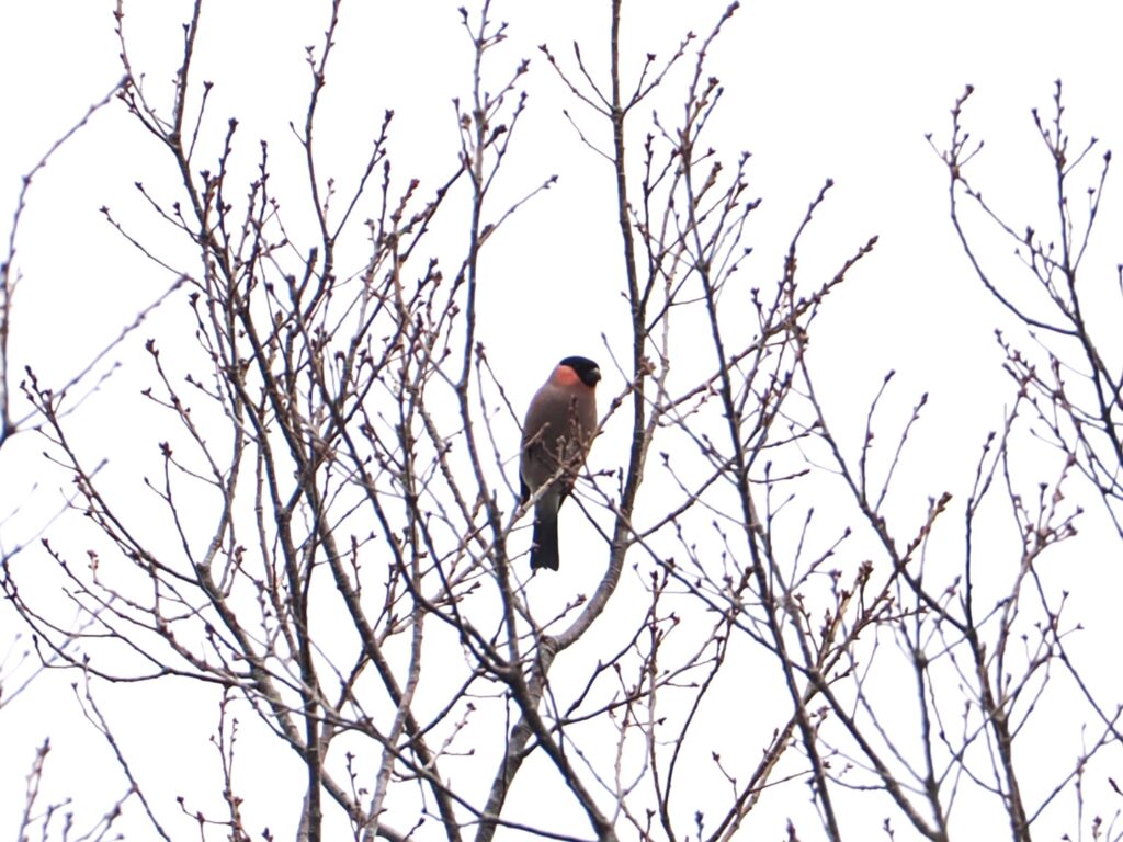 さて「ひょうたん池」を過ぎて運河から理窓公園内に入りました。今年の理窓公園には、ウソ、アカゲラ、ルリビタキが入っています。と言ってもタイミング、巡り合わせで簡単には見られません。32名の大所帯となると尚更です。聞き耳を立てながら全集中で進みます。右手に広がる草藪ではアオジ、ホオジロの地鳴きが聞こえます。中央の枯れ木で小鳥たちがかすかに動いていました。エナガ? メジロ? その中に黒い頭のウソが混じっていました。見た人はラッキー、見られなかった人残念、私も見られませんでした。