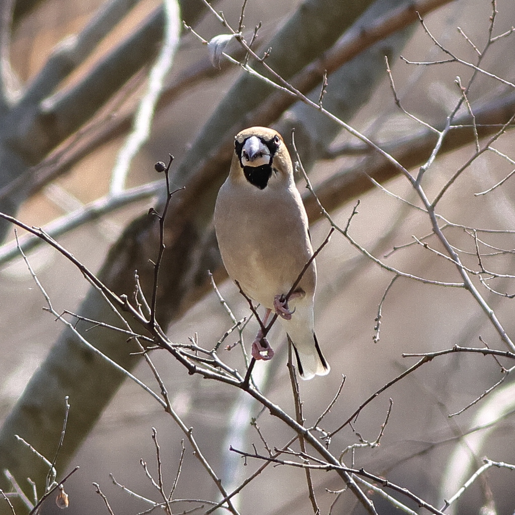 水路際の立ち並ぶ樹木にカワラヒワが数羽いました。先入観は禁物、その中になんとベニマシコが混じり、その先にジョウビタキが隠れ、一瞬シメの太いクチバシがチラリ・・・