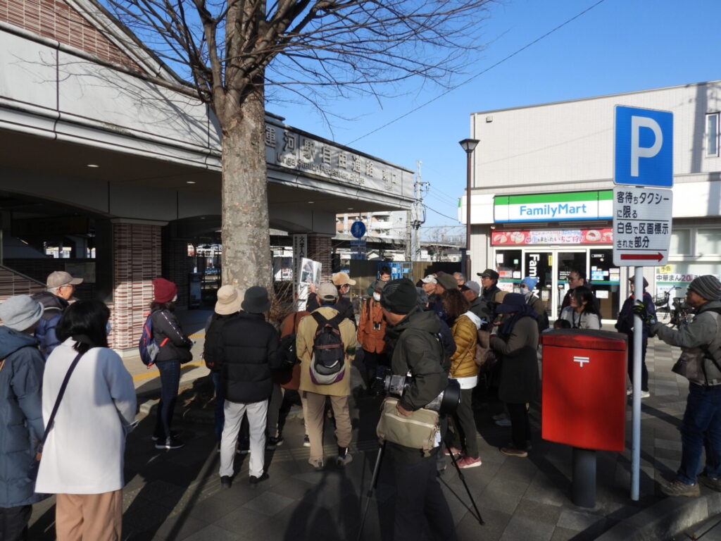 集合時間の20分前には、会員22名+web会員10名の32名の皆さんが、所狭しと準備万端です。慌ただしく出欠確認、初参加者へのフォロー、久しぶりの方々との挨拶にと押され気味・・・。 先ずは外の東口広場に出て仕切り直し、今年最初の定例会がスタートとなりました。